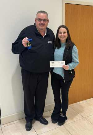 Pictured below: Site Manager Abby Miller presents Moses Toyota with a Champion for Children medal.